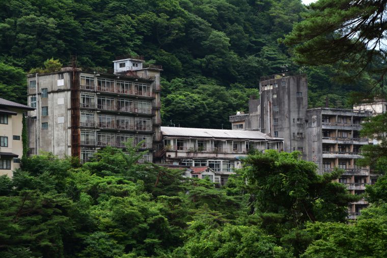 ふるさと観光ホテルは2012年に経営難で破産し、一部が解体されたものの、現在も遺構が残っています。