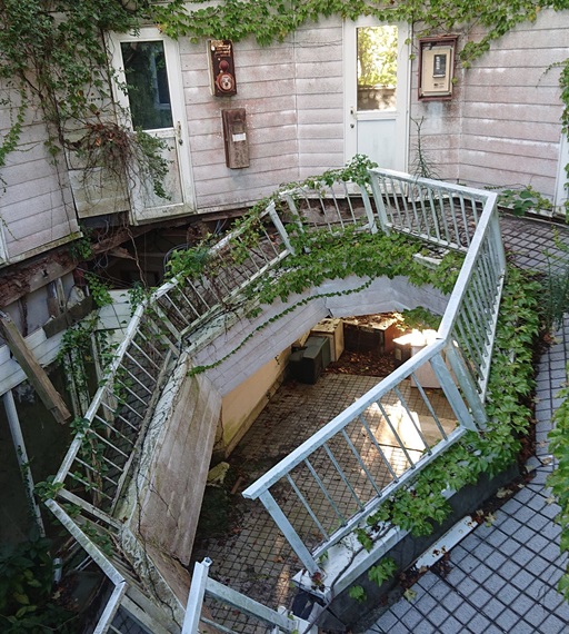 階段の手すりは錆び、入口の天井部分は一部崩落し、建物全体が蔦で覆われている状態です。