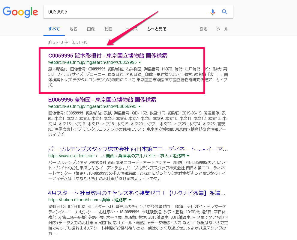 すると検索トップに数字もろかぶりの東京国立博物館の画像がヒットします