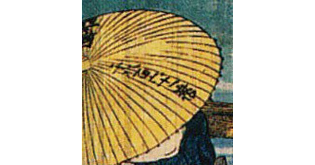 右下の男が手にする傘に記された