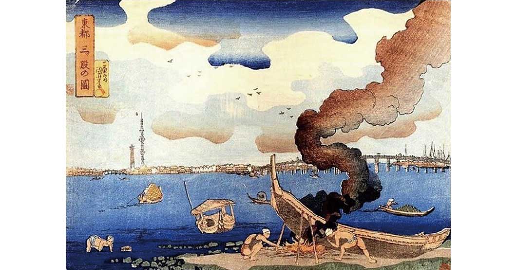 浮世絵「東都三ッ股の図」に描かれたスカイツリー