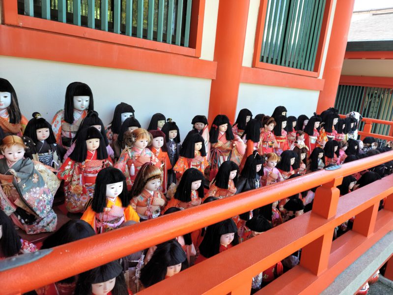 淡嶋神社の人形供養はテレビで話題になり、境内に並ぶ多数の人形が