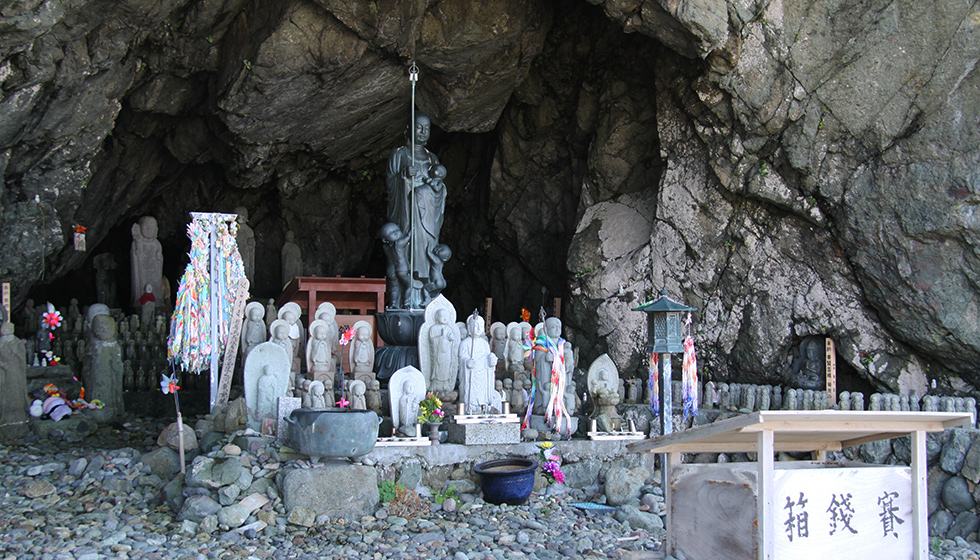 海岸近くの洞窟にあるこの場所には、観音様や地蔵が並び、供養のための