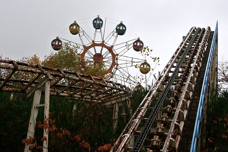 かつては賑わう遊園地でしたが、今では閉園し、荒れ果てた姿が残っています。